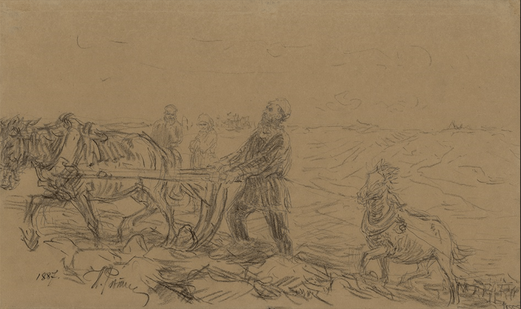 «Une chaude journée d’août, en plein soleil, après le petit déjeuner, Lev Nikolayevich allait labourer le champ de la veuve… Pendant six heures, sans repos, il a labouré la terre noire avec une charrue, puis en montant, puis en descendant le terrain en pente jusqu’au ravin. J’avais un album entre les mains, et, sans perdre de temps, je me suis planté devant le milieu de la file de son passage et j’ai saisi les traits de l’instant où tout le cortège passe à côté de moi. Cela a duré moins d’une minute, et, pour doubler le temps, j’ai fait une transition à travers le labour jusqu’au point opposé, à une vingtaine de pas, et je suis resté là à attendre le groupe. J’ai vérifié uniquement les contours et les rapports de taille des formes; des ombres après, à partir d’un point, à un moment donné.