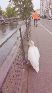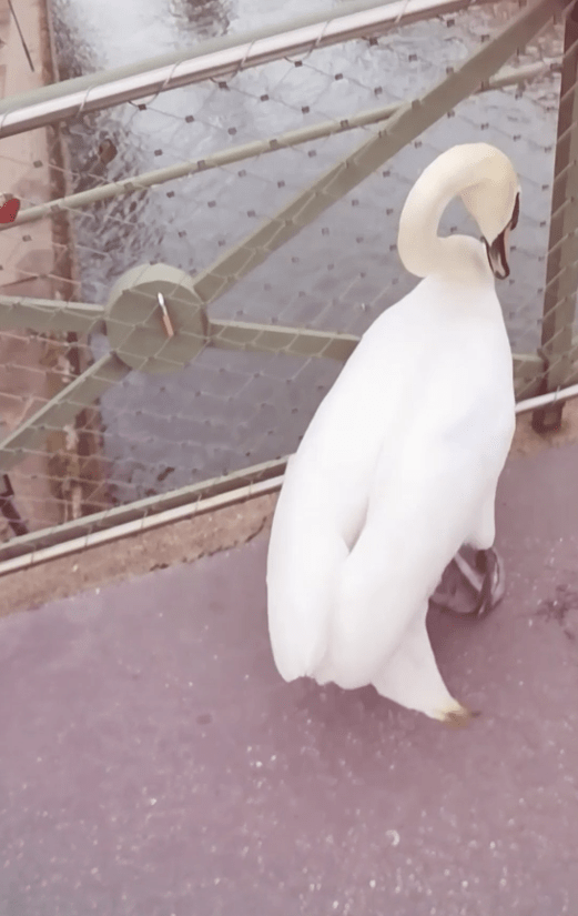 As you can see in the video, the swan is walking along the river, unable to get through the fence. You can see from a distance that he makes itself look fat when he’s all alone, trying to scare the fence into leaving.