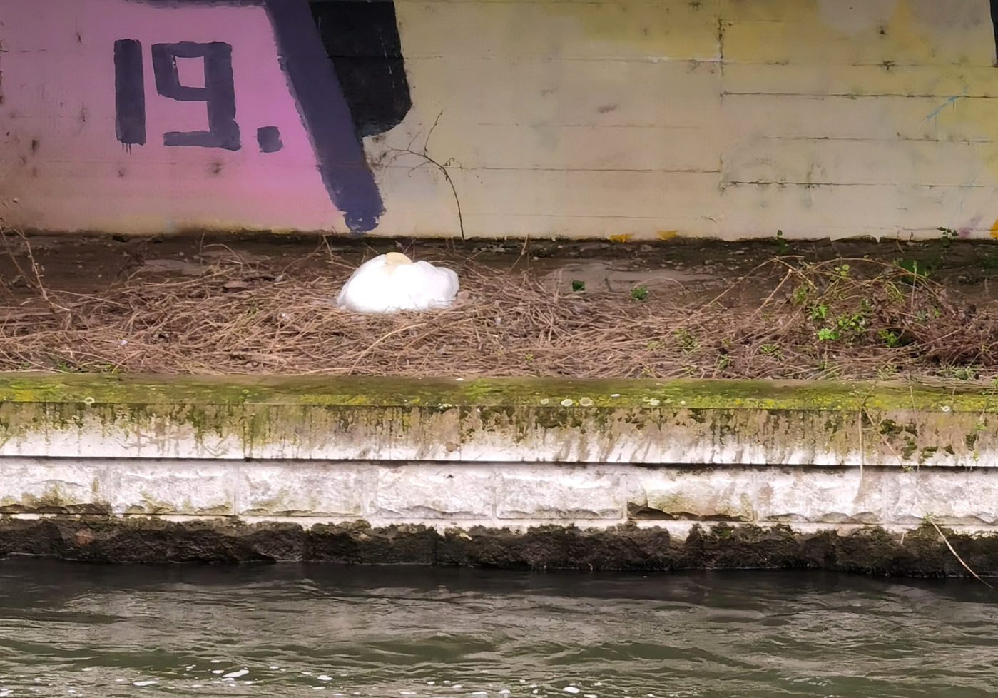 Generally, swan nests are located on the ground near water and measure about a meter in diameter. Unlike many other ducks and geese, the male participates in nest construction and also takes turns incubating the eggs. They are very protective of their nests and will viciously attack anything they perceive as a threat to their chicks, including humans. By pure luck, I found one in the center of Strasbourg (Not during our rescue).