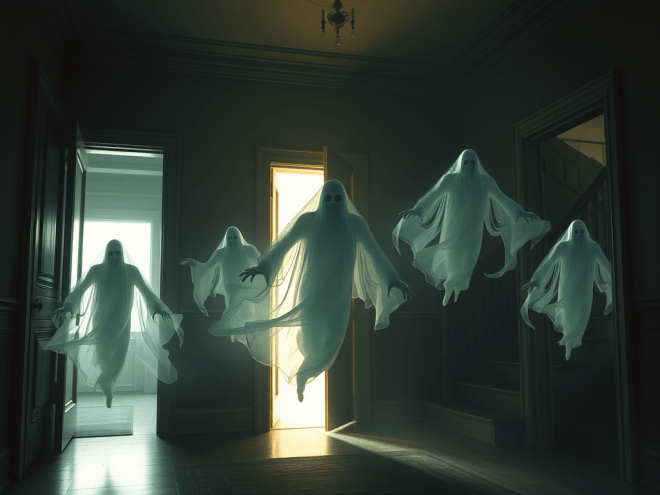 | Are haunted houses. Through the open doors | Sont des maisons hantées. À travers les portes ouvertes |