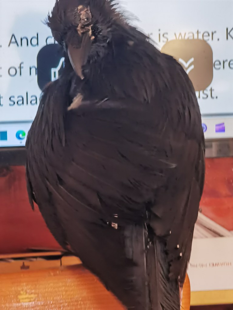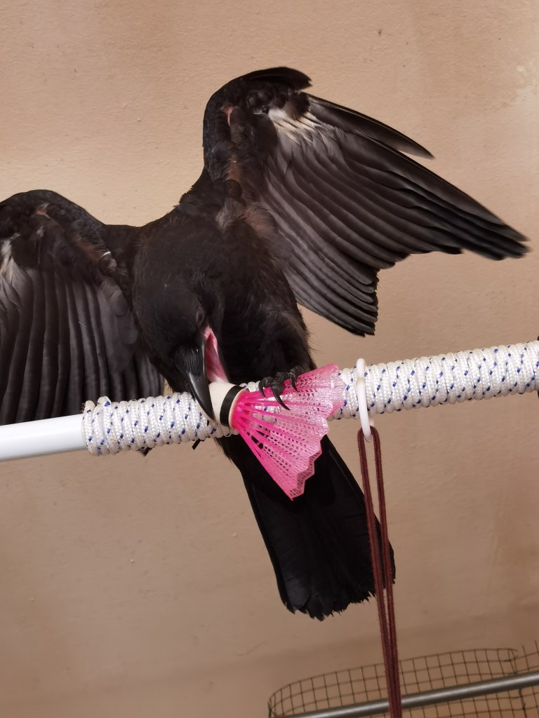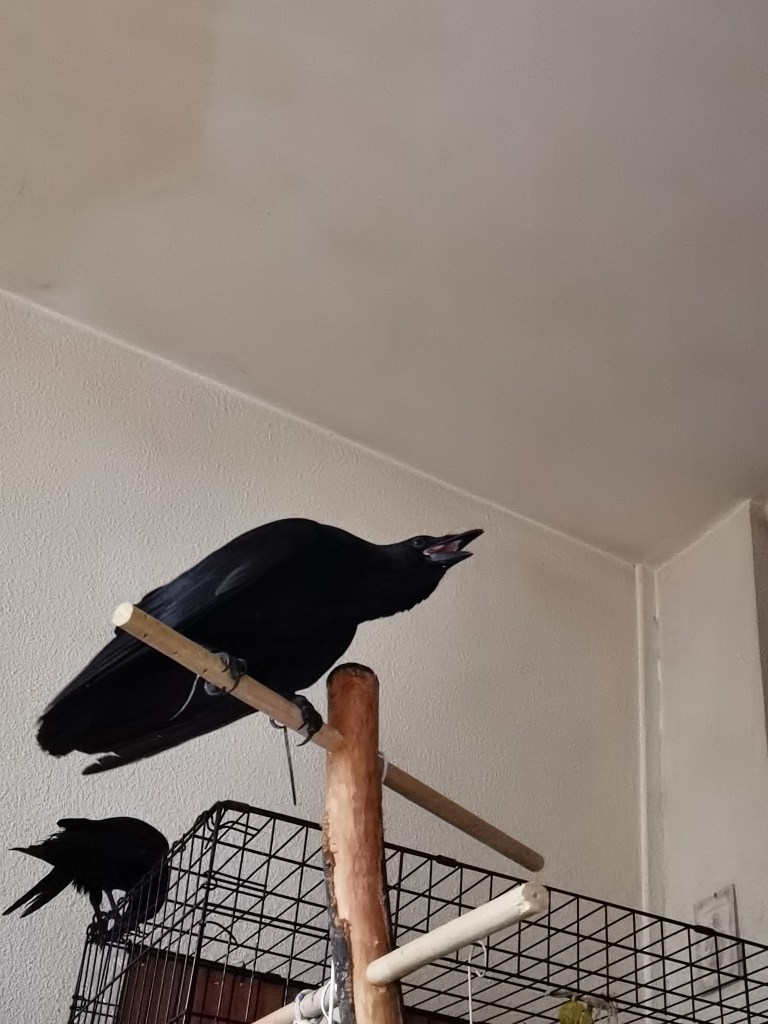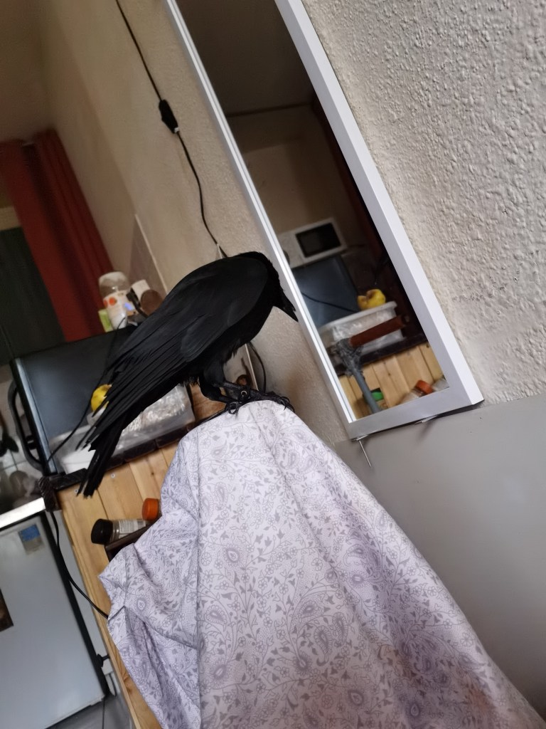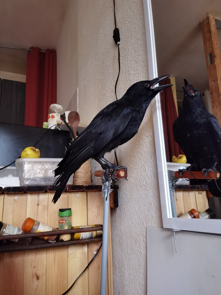 Pacha, notre jeune corbeau, est vraiment un personnage ! Bien qu’il refuse encore de sortir, il apporte de la joie en interagissant avec tout ce qui l’entoure—des jouets au clavier de l’ordinateur ainsi qu’avec ses repas. Son dédain initial pour le miroir s’est transformé en une petite aventure hilarante, alors qu’il s’engageait joyeusement avec lui. Il adore absolument le papier, s’enfuyant souvent avec, et porter des œufs devient son petit passe-temps délicieux !