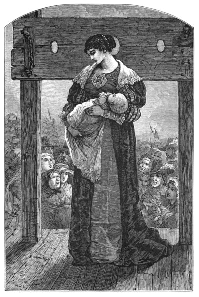 When the young woman—the mother of this child—stood fully revealed before the crowd, it seemed to be her first impulse to clasp the infant closely to her bosom; not so much by an impulse of motherly affection, as that she might thereby conceal a certain token, which was wrought or fastened into her dress. In a moment, however, wisely judging that one token of her shame would but poorly serve to hide another, she took the baby on her arm, and, with a burning blush, and yet a haughty smile, and a glance that would not be abashed, looked around at her towns-people and neighbors. On the breast of her gown, in fine red cloth, surrounded with an elaborate embroidery and fantastic flourishes of gold-thread, appeared the letter A. It was so artistically done, and with so much fertility and gorgeous luxuriance of fancy, that it had all the effect of a last and fitting decoration to the apparel which she wore; and which was of a splendor in accordance with the taste of the age, but greatly beyond what was allowed by the sumptuary regulations of the colony.