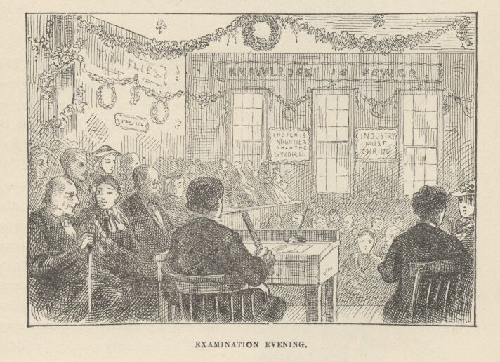 | In the fulness of time the interesting occasion arrived. At eight in the evening the schoolhouse was brilliantly lighted, and adorned with wreaths and festoons of foliage and flowers. The master sat throned in his great chair upon a raised platform, with his blackboard behind him. He was looking tolerably mellow. Three rows of benches on each side and six rows in front of him were occupied by the dignitaries of the town and by the parents of the pupils. To his left, back of the rows of citizens, was a spacious temporary platform upon which were seated the scholars who were to take part in the exercises of the evening; rows of small boys, washed and dressed to an intolerable state of discomfort; rows of gawky big boys; snowbanks of girls and young ladies clad in lawn and muslin and conspicuously conscious of their bare arms, their grandmothers’ ancient trinkets, their bits of pink and blue ribbon and the flowers in their hair. All the rest of the house was filled with non-participating scholars. | À huit heures, l’école ouvrit ses portes. Elle était brillamment illuminée et décorée de couronnes, de feuillages et de fleurs. Le maître présidait devant son tableau noir. Sa chaire trônait sur une estrade surélevée qui dominait toute l’assemblée. Il était visiblement éméché. Les notables et les parents d’élèves avaient pris place sur des bancs en face de lui. À sa gauche, sur une plate-forme de circonstance, se tenaient, assis en rangs serrés, les élèves qui devaient prendre part aux exercices de la soirée : petits garçons horriblement gênés dans leur peau et leurs vêtements trop propres, adolescents gauches, fillettes et jeunes filles noyées sous une neige de batiste et de mousseline, toutes visiblement conscientes de leurs bras nus, des petits bijoux de la grand-mère, de leurs bouts de rubans roses et bleus, et de leurs cheveux piqués de fleurs. |