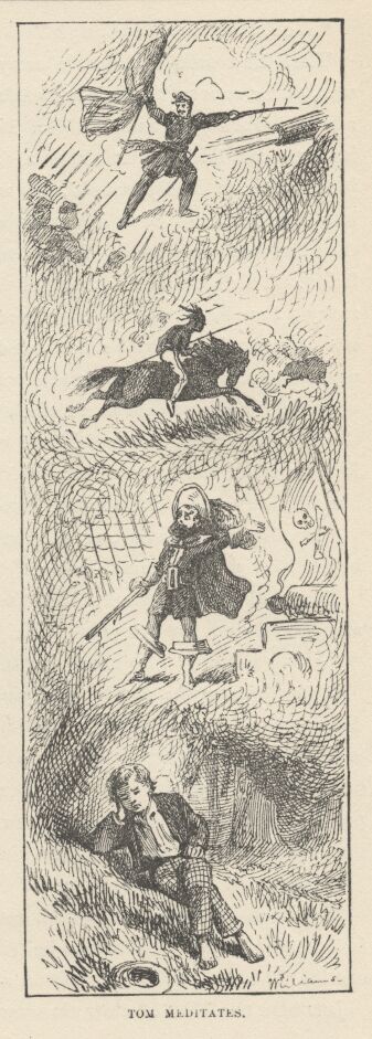 | But the elastic heart of youth cannot be compressed into one constrained shape long at a time. Tom presently began to drift insensibly back into the concerns of this life again. What if he turned his back, now, and disappeared mysteriously? What if he went away—ever so far away, into unknown countries beyond the seas—and never came back any more! How would she feel then! The idea of being a clown recurred to him now, only to fill him with disgust. For frivolity and jokes and spotted tights were an offense, when they intruded themselves upon a spirit that was exalted into the vague august realm of the romantic. No, he would be a soldier, and return after long years, all war-worn and illustrious. No—better still, he would join the Indians, and hunt buffaloes and go on the warpath in the mountain ranges and the trackless great plains of the Far West, and away in the future come back a great chief, bristling with feathers, hideous with paint, and prance into Sunday-school, some drowsy summer morning, with a blood-curdling war-whoop, and sear the eyeballs of all his companions with unappeasable envy. But no, there was something gaudier even than this. He would be a pirate! That was it! now his future lay plain before him, and glowing with unimaginable splendor. How his name would fill the world, and make people shudder! How gloriously he would go plowing the dancing seas, in his long, low, black-hulled racer, the Spirit of the Storm, with his grisly flag flying at the fore! And at the zenith of his fame, how he would suddenly appear at the old village and stalk into church, brown and weather-beaten, in his black velvet doublet and trunks, his great jack-boots, his crimson sash, his belt bristling with horse-pistols, his crime-rusted cutlass at his side, his slouch hat with waving plumes, his black flag unfurled, with the skull and crossbones on it, and hear with swelling ecstasy the whisperings, “It’s Tom Sawyer the Pirate!—the Black Avenger of the Spanish Main!” | Cependant, les cœurs juvéniles se refusent à supporter trop longtemps le poids du chagrin. Peu à peu, Tom revint à la vie et à des préoccupations plus terre à terre. Que se passerait-il s’il disparaissait mystérieusement ? Que se passerait-il s’il traversait l’Océan et gagnait des terres inconnues pour ne plus jamais revenir ? Qu’en penserait Becky ? Il se souvint alors d’avoir manifesté le désir d’être clown. Pouah ! Quelle horreur ! La vie frivole, les plaisanteries, les costumes pailletés ! Quelle injure pour un esprit qui se mouvait avec tant d’aisance dans l’auguste domaine de l’imagination romanesque. Non, il serait soldat et reviendrait au pays tout couvert de décorations, de cicatrices et de gloire. Non, mieux que cela. Il irait rejoindre les Indiens. Il chasserait le bison avec eux, il ferait la guerre dans les montagnes, il parcourrait les plaines désertes du Far West. Plus tard, il deviendrait un grand chef tout couvert de plumes et de tatouages hideux. Un jour d’été, alors que tous les élèves somnoleraient, il ferait son entrée, en pleine classe du dimanche, et pousserait un cri de guerre qui glacerait tous les assistants d’épouvante et remplirait d’une folle jalousie les yeux de ses camarades. Mais non, il y avait encore bien mieux. Il serait pirate. C’est cela. Pirate. Maintenant son avenir lui apparaissait tout tracé, tout auréolé de hauts faits. Son nom serait connu dans le monde entier et inspirerait aux gens une sainte terreur. Son navire, L’Esprit des Tempêtes, labourerait les mers d’une étrave glorieuse tandis que son pavillon noir, cloué à la corne du mât, claquerait fièrement au vent. Alors, à l’apogée de sa gloire, il reviendrait brusquement respirer l’air du pays natal, il entrerait à l’église de sa démarche hardie, le visage basané, tanné par le souffle du large. Il porterait un costume de velours noir, de hautes bottes à revers, une ceinture cramoisie à laquelle seraient passés de longs pistolets. Son coutelas, rouillé à force de crimes, lui battrait la hanche, une plume ornerait son chapeau de feutre, et déjà il entendait avec délices la foule murmurer à voix basse : « C’est Tom Sawyer, le pirate, le pirate noir de la mer des Antilles. » |