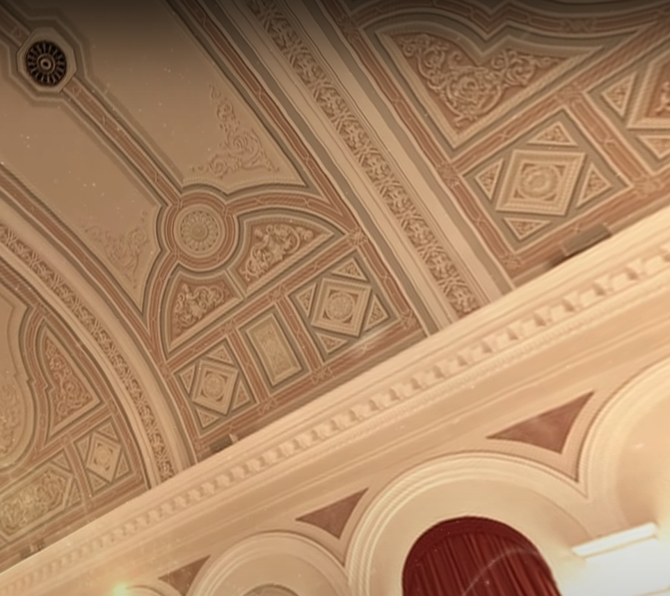 The chandelier of the auditorium was originally light by 300 oil lamps. The lamps were raised through a hole in the ceiling to be lit, and around this hole the Academician Alexei Titov painted “Apollo and the Muses” but instead of one of the canonical muses, the muse of the sacred hymns of Polyhymnia, Titov depicted the muse of painting invented by him, with a palette and a brush in her hands.
