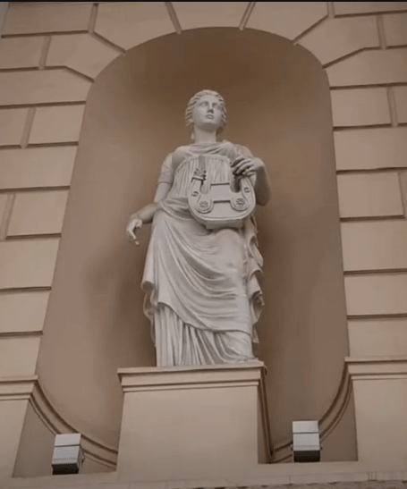 Albert Kavos was the new architect and the Theater was restored in three years. The volume of the building and the layout were preserved, but the height was slightly increased. Albert Kavos changed the proportions and completely redesigned the architectural decor, designing the facades in the spirit of early eclecticism. Instead of the alabaster sculpture of Apollo that died in the fire, a bronze quadriga by Pyotr Klodt was placed over the entrance of the portico, and a plaster double headed eagle which is the state emblem of the Russian Empire was placed on the pediment.