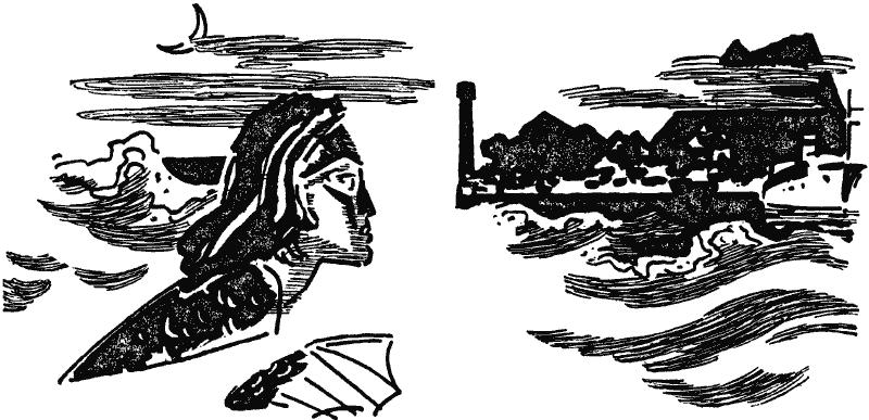 Дробь судовых моторов раздается с разных сторон: пробуждаются порт и залив. Ихтиандр открывает глаза, трясет головой, словно отряхивает последнюю дремоту, взмахивает руками, отталкивается ногами и всплывает на поверхность.
