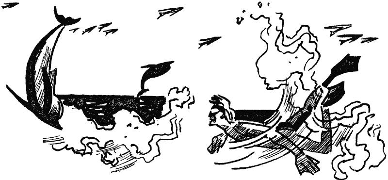 Вот ухо улавливает глухой грохочущий звук, за ним другой, третий. Это гремят якорные цепи: в заливе, за несколько километров от Ихтиандра, рыбачьи шхуны снимаются с якоря. Рассвет близок. А вот далекий-далекий мерный рокот. Это винт и моторы «Горрокса» — большого английского океанского парохода, совершающего рейс между Буэнос-Айресом и Ливерпулем. «Горрокс» еще километрах в сорока. А как слышно! Звук проходит в морской воде полторы тысячи метров в секунду. Как красив «Горрокс» ночью — настоящий плавучий город, залитый огнями! Но, чтобы увидеть его ночью, надо с вечера выплыть далеко в открытое море. В Буэнос-Айрес «Горрокс» приходит при свете восходящего солнца уже с погашенными огнями. Нет, дремать больше уже не придется: винты, рули и моторы «Горрокса», колебания его корпуса, огни иллюминаторов и прожекторов разбудят обитателей океана. Наверное, дельфины первые услышали приближение «Горрокса» и, ныряя, подняли несколько минут тому назад легкое волнение, которое заставило Ихтиандра насторожиться. И наверное, они уже помчались навстречу пароходу.