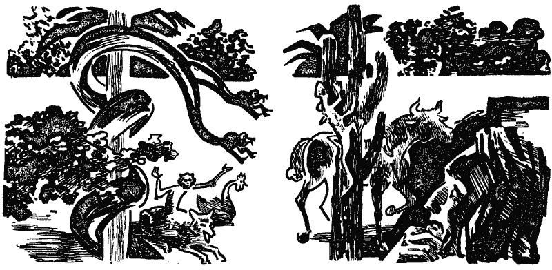 Две ламы промчались по поляне, помахивая лошадиными хвостами. Из травы, из зарослей кустарников, с ветвей деревьев глядели на Кристо необычные гады, звери и птицы: собаки с кошачьими головами, гуси с петушиными головами, рогатые кабаны, страусы-нанду с клювами орлов, бараны с телом пумы…