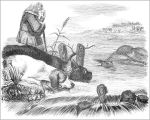 There was another bad manitou at the mouth of Superior Bay, where conflicting currents make a pother of waters. This spirit sat on the bottom of the lake, gazing upward, and if any boatman ventured to cross his domain without dropping a pipe or beads or hatchet into it, woe betide him, for his boat would be caught in a current and smashed against a rocky shore. Perhaps the most vexatious god was he who ruled the Floating Islands. These islands were beautiful with trees and flowers, metal shone and crystals sparkled on their ledges, sweet fruits grew in plenty, and song-birds flitted over them. In wonder and delight the hunter would speed toward them in his canoe, but as he neared their turfy banks the jealous manitou, who kept these fairy lands for his own pleasure, would throw down a fog and shut them out of sight. Never could the hunter set foot on them, no matter how long he kept up his search.