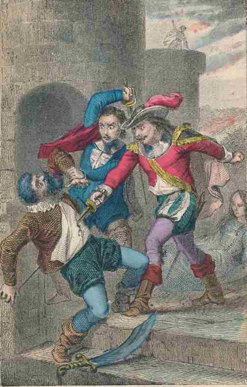 Il reconnut que c’était les frères de sa femme, l’un dragon et l’autre mousquetaire, de sorte qu’il s’enfuit aussitôt pour se sauver ; mais les deux frères le poursuivirent de si près, qu’ils l’attrapèrent avant qu’il pût gagner le perron.