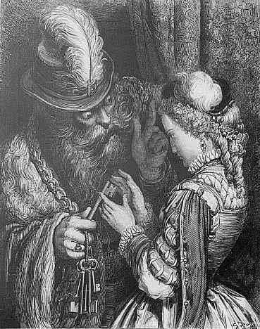 Pour cette petite clef-ci, c’est la clef du cabinet au bout de la grande galerie de l’appartement bas : ouvrez tout, allez partout, mais pour ce petit cabinet, je vous défends d’y entrer, et je vous le défends de telle sorte que, s’il vous arrive de l’ouvrir, il n’y a rien que vous ne deviez attendre de ma colère.
