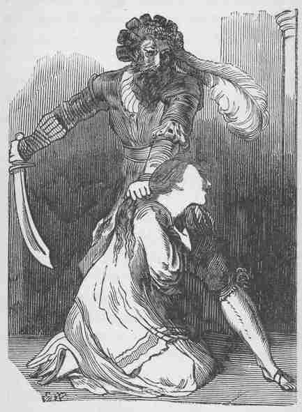 Puis la prenant d’une main par les cheveux, et de l’autre levant le coutelas en l’air, il allait lui abattre la tête.