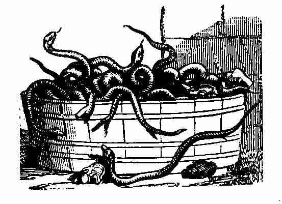 L’ogresse reconnut la voix de la reine et de ses enfants, et, furieuse d’avoir été trompée, elle commanda dès le lendemain matin, avec une voix épouvantable qui faisait trembler tout le monde, qu’on apportât au milieu de la cour une grande cuve, qu’elle fit remplir de vipères, de crapauds, de couleuvres et de serpents, pour y faire jeter la reine et ses enfants, le maître d’hôtel, sa femme et sa servante : elle avait donné l’ordre de les amener les mains liées derrière le dos.