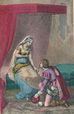 Il entre dans une chambre toute dorée, et il voit sur un lit, dont les rideaux étaient ouverts de tous côtés, le plus beau spectacle qu’il eût jamais vu : une princesse qui paraissait avoir quinze ou seize ans, et dont l’éclat resplendissant avait quelque chose de lumineux et de divin.