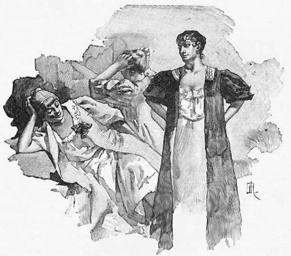 La porte s’ouvrit brusquement et M. Tournevau parut. Des cris d’enthousiasme éclatèrent : « Vive Tournevau ! » Et Raphaële, qui pivotait toujours, alla tomber sur son cœur. Il la saisit d’un enlacement formidable et, sans dire un mot, l’enlevant de terre comme une plume, il traversa le salon, gagna la porte du fond et disparut dans l’escalier des chambres avec son fardeau vivant, au milieu des applaudissements.