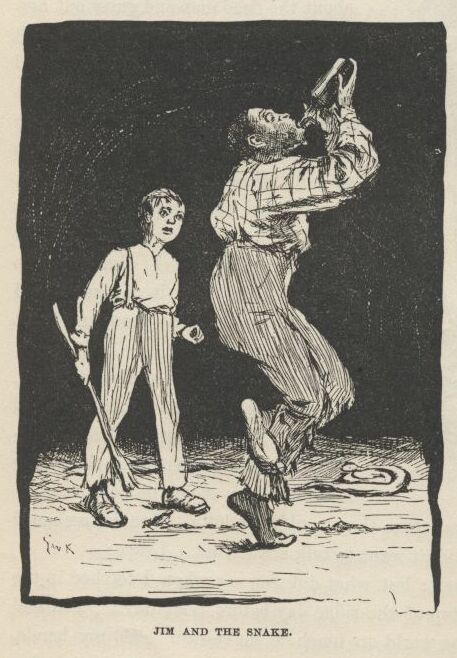 Jim sucked and sucked at the jug, and now and then he got out of his head and pitched around and yelled; but every time he come to himself he went to sucking at the jug again. His foot swelled up pretty big, and so did his leg; but by and by the drunk begun to come, and so I judged he was all right; but I’d druther been bit with a snake than pap’s whisky.