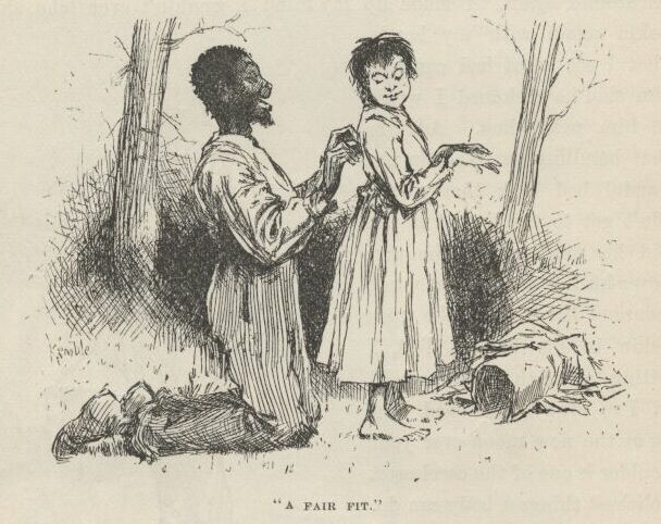 Next morning I said it was getting slow and dull, and I wanted to get a stirring up some way. I said I reckoned I would slip over the river and find out what was going on. Jim liked that notion; but he said I must go in the dark and look sharp. Then he studied it over and said, couldn’t I put on some of them old things and dress up like a girl? That was a good notion, too. So we shortened up one of the calico gowns, and I turned up my trouser-legs to my knees and got into it. Jim hitched it behind with the hooks, and it was a fair fit. I put on the sun-bonnet and tied it under my chin, and then for a body to look in and see my face was like looking down a joint of stove-pipe. Jim said nobody would know me, even in the daytime, hardly. I practiced around all day to get the hang of the things, and by and by I could do pretty well in them, only Jim said I didn’t walk like a girl; and he said I must quit pulling up my gown to get at my britches-pocket. I took notice, and done better.