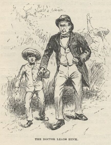 It was nuts for the crowd, though maybe not for the king’s friends; so we all started. It was about sundown. The doctor he led me along by the hand, and was plenty kind enough, but he never let go my hand.
