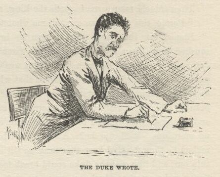 So they got some paper and a pen, and the king he set down and twisted his head to one side, and chawed his tongue, and scrawled off something; and then they give the pen to the duke—and then for the first time the duke looked sick. But he took the pen and wrote. So then the lawyer turns to the new old gentleman and says: