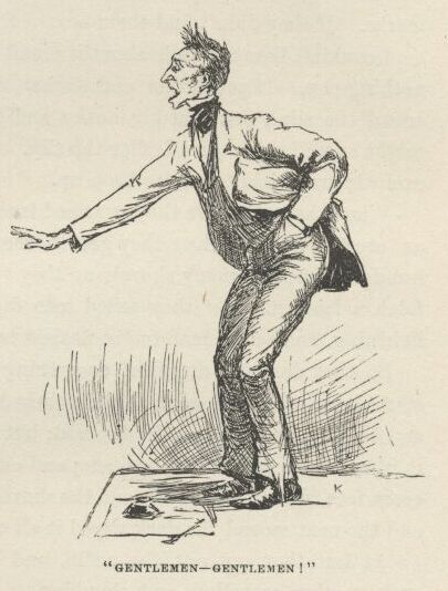 They was fetching a very nice-looking old gentleman along, and a nice-looking younger one, with his right arm in a sling. And, my souls, how the people yelled and laughed, and kept it up. But I didn’t see no joke about it, and I judged it would strain the duke and the king some to see any. I reckoned they’d turn pale. But no, nary a pale did they turn. The duke he never let on he suspicioned what was up, but just went a goo-gooing around, happy and satisfied, like a jug that’s googling out buttermilk; and as for the king, he just gazed and gazed down sorrowful on them new-comers like it give him the stomach-ache in his very heart to think there could be such frauds and rascals in the world. Oh, he done it admirable. Lots of the principal people gethered around the king, to let him see they was on his side. That old gentleman that had just come looked all puzzled to death. Pretty soon he begun to speak, and I see straight off he pronounced like an Englishman—not the king’s way, though the king’s was pretty good for an imitation. I can’t give the old gent’s words, nor I can’t imitate him; but he turned around to the crowd, and says, about like this: