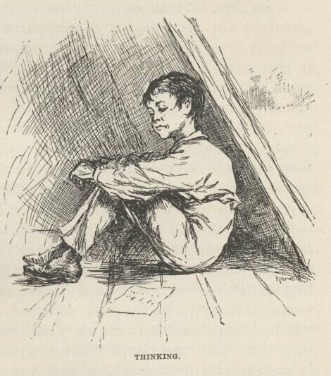I didn’t have none, so he left. I went to the raft, and set down in the wigwam to think. But I couldn’t come to nothing. I thought till I wore my head sore, but I couldn’t see no way out of the trouble. After all this long journey, and after all we’d done for them scoundrels, here it was all come to nothing, everything all busted up and ruined, because they could have the heart to serve Jim such a trick as that, and make him a slave again all his life, and amongst strangers, too, for forty dirty dollars.