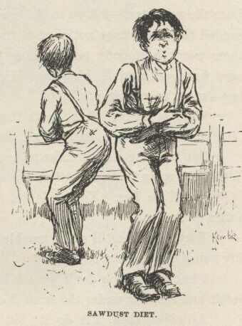 Well, by the end of three weeks everything was in pretty good shape. The shirt was sent in early, in a pie, and every time a rat bit Jim he would get up and write a little in his journal whilst the ink was fresh; the pens was made, the inscriptions and so on was all carved on the grindstone; the bed-leg was sawed in two, and we had et up the sawdust, and it give us a most amazing stomach-ache. We reckoned we was all going to die, but didn’t. It was the most undigestible sawdust I ever see; and Tom said the same.