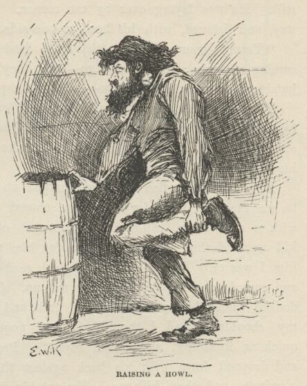 Pap was agoing on so he never noticed where his old limber legs was taking him to, so he went head over heels over the tub of salt pork and barked both shins, and the rest of his speech was all the hottest kind of language—mostly hove at the nigger and the govment, though he give the tub some, too, all along, here and there. He hopped around the cabin considerable, first on one leg and then on the other, holding first one shin and then the other one, and at last he let out with his left foot all of a sudden and fetched the tub a rattling kick. But it warn’t good judgment, because that was the boot that had a couple of his toes leaking out of the front end of it; so now he raised a howl that fairly made a body’s hair raise, and down he went in the dirt, and rolled there, and held his toes; and the cussing he done then laid over anything he had ever done previous. He said so his own self afterwards. He had heard old Sowberry Hagan in his best days, and he said it laid over him, too; but I reckon that was sort of piling it on, maybe.