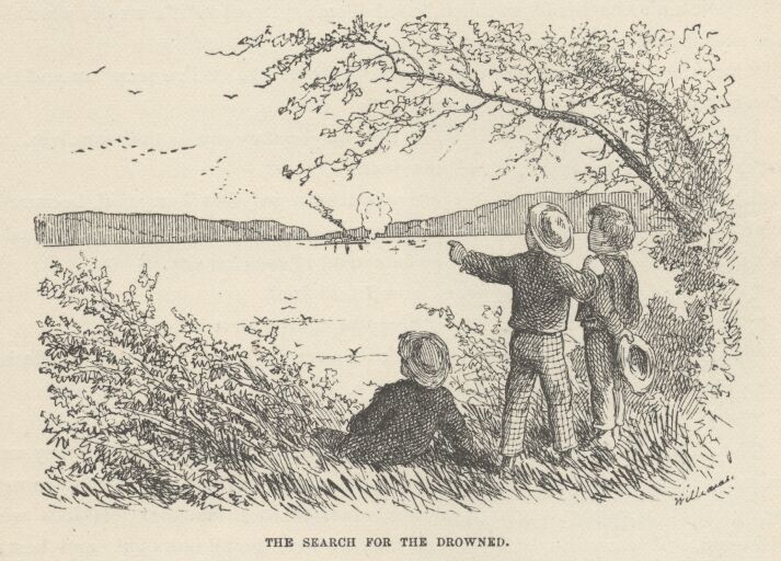 Ils se levèrent tous trois et se précipitèrent vers la rive qui faisait face au village. Ils écartèrent les broussailles et parcoururent le fleuve du regard. À deux kilomètres de Saint-Petersburg, le petit bac à vapeur dérivait avec le courant. Le pont était noir de monde. De nombreux petits canots l’entouraient, mais les garçons ne purent se rendre compte de ce qui s’y passait. Bientôt, un jet de fumée blanche fusa par-dessus le bordage du navire et monta nonchalamment vers le ciel tandis qu’une nouvelle détonation ébranlait l’air.
