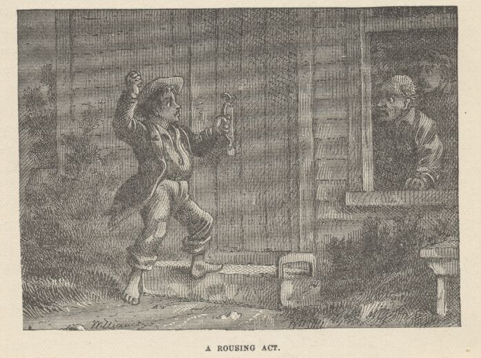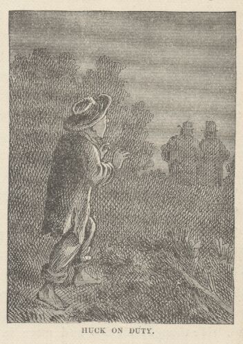 Trois minutes plus tard, le vieillard et ses fils gravissaient la colline et se dirigeaient vers la propriété de la veuve. Chacun d’eux tenait son fusil à la main. Huck les laissa à mi-chemin et se blottit derrière un arbre. Après un long silence, il entendit une détonation suivie d’un cri. Le jeune garçon n’attendit pas la suite et dévala la pente aussi vite que s’il avait eu tous les diables de l’enfer à ses trousses.