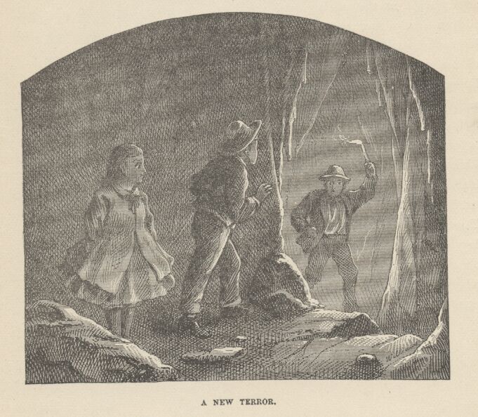 Becky partagea son désir et, après avoir laissé une marque à l’entrée de l’escalier, ils se lancèrent dans l’inconnu. Ils se faufilèrent ainsi dans les profondeurs secrètes de la grotte et, laissant derrière eux un nouveau point de repère, ils poursuivirent leurs investigations.