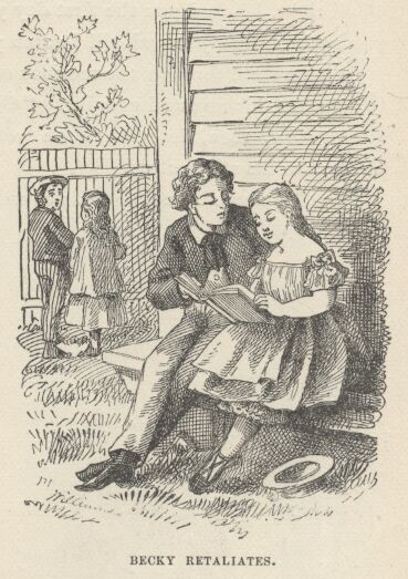 And so on, with clapping of joyful hands till all the group had begged for invitations but Tom and Amy. Then Tom turned coolly away, still talking, and took Amy with him. Becky’s lips trembled and the tears came to her eyes; she hid these signs with a forced gayety and went on chattering, but the life had gone out of the picnic, now, and out of everything else; she got away as soon as she could and hid herself and had what her sex call “a good cry.” Then she sat moody, with wounded pride, till the bell rang. She roused up, now, with a vindictive cast in her eye, and gave her plaited tails a shake and said she knew what she’d do.
