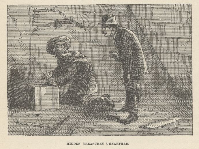 “Good idea,” said the comrade, who walked across the room, knelt down, raised one of the rearward hearth-stones and took out a bag that jingled pleasantly. He subtracted from it twenty or thirty dollars for himself and as much for Injun Joe, and passed the bag to the latter, who was on his knees in the corner, now, digging with his bowie-knife.