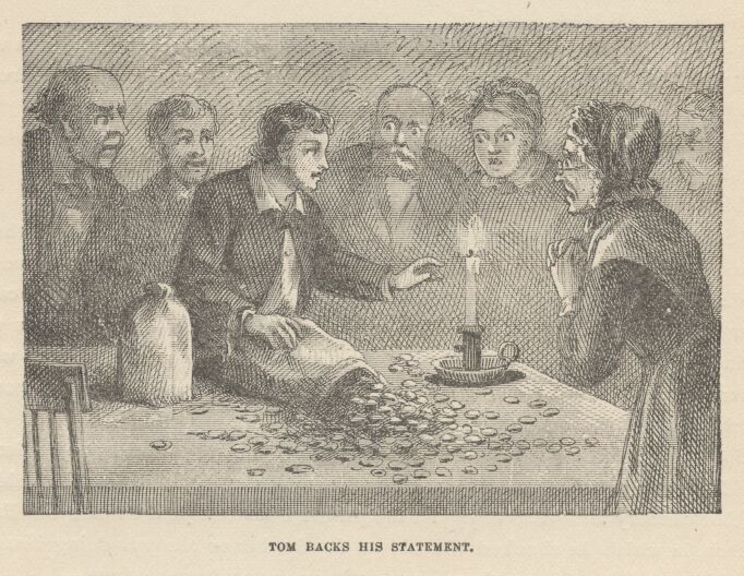 Tom entered, struggling with the weight of his sacks, and Aunt Polly did not finish her sentence. Tom poured the mass of yellow coin upon the table and said: