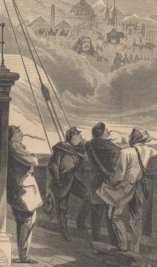 This supplementary program also instructed the excursionists to provide themselves with light musical instruments for amusement in the ship, with saddles for Syrian travel, green spectacles and umbrellas, veils for Egypt, and substantial clothing to use in rough pilgrimizing in the Holy Land. Furthermore, it was suggested that although the ship’s library would afford a fair amount of reading matter, it would still be well if each passenger would provide himself with a few guidebooks, a Bible, and some standard works of travel. A list was appended, which consisted chiefly of books relating to the Holy Land, since the Holy Land was part of the excursion and seemed to be its main feature.