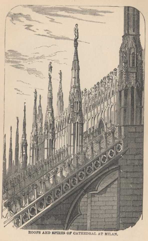 We wished to go aloft. The sacristan showed us a marble stairway (of course it was marble, and of the purest and whitest—there is no other stone, no brick, no wood, among its building materials) and told us to go up one hundred and eighty-two steps and stop till he came. It was not necessary to say stop—we should have done that any how. We were tired by the time we got there. This was the roof. Here, springing from its broad marble flagstones, were the long files of spires, looking very tall close at hand, but diminishing in the distance like the pipes of an organ. We could see now that the statue on the top of each was the size of a large man, though they all looked like dolls from the street. We could see, also, that from the inside of each and every one of these hollow spires, from sixteen to thirty-one beautiful marble statues looked out upon the world below.
