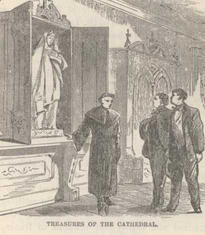 We descended and entered. Within the church, long rows of fluted columns, like huge monuments, divided the building into broad aisles, and on the figured pavement fell many a soft blush from the painted windows above. I knew the church was very large, but I could not fully appreciate its great size until I noticed that the men standing far down by the altar looked like boys, and seemed to glide, rather than walk. We loitered about gazing aloft at the monster windows all aglow with brilliantly colored scenes in the lives of the Saviour and his followers. Some of these pictures are mosaics, and so artistically are their thousand particles of tinted glass or stone put together that the work has all the smoothness and finish of a painting. We counted sixty panes of glass in one window, and each pane was adorned with one of these master achievements of genius and patience.