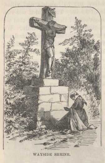 We saw interior Italy, now. The houses were of solid stone, and not often in good repair. The peasants and their children were idle, as a general thing, and the donkeys and chickens made themselves at home in drawing-room and bed-chamber and were not molested. The drivers of each and every one of the slow-moving market-carts we met were stretched in the sun upon their merchandise, sound a sleep. Every three or four hundred yards, it seemed to me, we came upon the shrine of some saint or other–a rude picture of him built into a huge cross or a stone pillar by the road-side.–Some of the pictures of the Saviour were curiosities in their way. They represented him stretched upon the cross, his countenance distorted with agony. From the wounds of the crown of thorns; from the pierced side; from the mutilated hands and feet; from the scourged body–from every hand-breadth of his person streams of blood were flowing! Such a gory, ghastly spectacle would frighten the children out of their senses, I should think. There were some unique auxiliaries to the painting which added to its spirited effect. These were genuine wooden and iron implements, and were prominently disposed round about the figure: a bundle of nails; the hammer to drive them; the sponge; the reed that supported it; the cup of vinegar; the ladder for the ascent of the cross; the spear that pierced the Saviour’s side. The crown of thorns was made of real thorns, and was nailed to the sacred head. In some Italian church-paintings, even by the old masters, the Saviour and the Virgin wear silver or gilded crowns that are fastened to the pictured head with nails. The effect is as grotesque as it is incongruous.