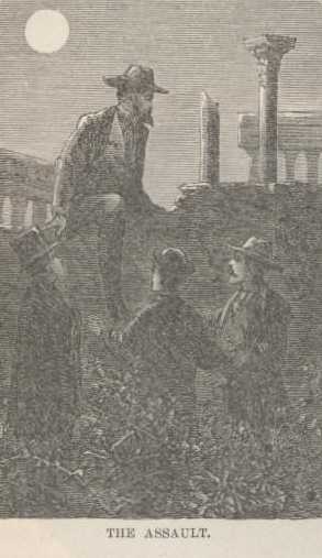 As we marched along, we began to get over our fears, and ceased to care much about quarantine scouts or any body else. We grew bold and reckless; and once, in a sudden burst of courage, I even threw a stone at a dog. It was a pleasant reflection, though, that I did not hit him, because his master might just possibly have been a policeman. Inspired by this happy failure, my valor became utterly uncontrollable, and at intervals I absolutely whistled, though on a moderate key. But boldness breeds boldness, and shortly I plunged into a Vineyard, in the full light of the moon, and captured a gallon of superb grapes, not even minding the presence of a peasant who rode by on a mule. Denny and Birch followed my example.