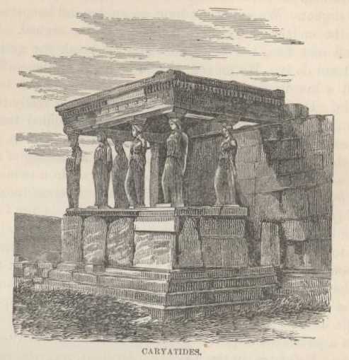 We crossed a large court, entered a great door, and stood upon a pavement of purest white marble, deeply worn by footprints. Before us, in the flooding moonlight, rose the noblest ruins we had ever looked upon—the Propylae; a small Temple of Minerva; the Temple of Hercules, and the grand Parthenon. [We got these names from the Greek guide, who didn’t seem to know more than seven men ought to know.] These edifices were all built of the whitest Pentelic marble, but have a pinkish stain upon them now. Where any part is broken, however, the fracture looks like fine loaf sugar. Six caryatides, or marble women, clad in flowing robes, support the portico of the Temple of Hercules, but the porticos and colonnades of the other structures are formed of massive Doric and Ionic pillars, whose flutings and capitals are still measurably perfect, notwithstanding the centuries that have gone over them and the sieges they have suffered. The Parthenon, originally, was two hundred and twenty-six feet long, one hundred wide, and seventy high, and had two rows of great columns, eight in each, at either end, and single rows of seventeen each down the sides, and was one of the most graceful and beautiful edifices ever erected.