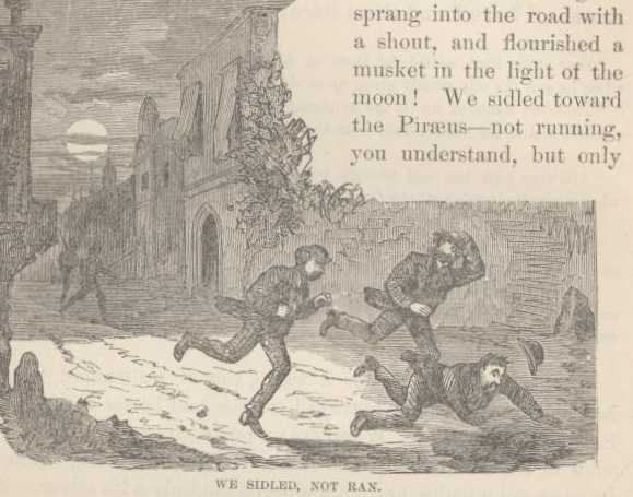 Two other passengers ran the blockade successfully last night. So we learned this morning. They slipped away so quietly that they were not missed from the ship for several hours. They had the hardihood to march into the Piraeus in the early dusk and hire a carriage. They ran some danger of adding two or three months’ imprisonment to the other novelties of their Holy Land Pleasure Excursion. I admire “cheek.”—[Quotation from the Pilgrims.]—But they went and came safely, and never walked a step.