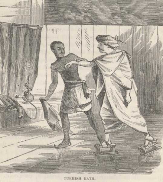 When I think how I have been swindled by books of Oriental travel, I want a tourist for breakfast. For years and years I have dreamed of the wonders of the Turkish bath; for years and years I have promised myself that I would yet enjoy one. Many and many a time, in fancy, I have lain in the marble bath, and breathed the slumbrous fragrance of Eastern spices that filled the air; then passed through a weird and complicated system of pulling and hauling, and drenching and scrubbing, by a gang of naked savages who loomed vast and vaguely through the steaming mists, like demons; then rested for a while on a divan fit for a king; then passed through another complex ordeal, and one more fearful than the first; and, finally, swathed in soft fabrics, been conveyed to a princely saloon and laid on a bed of eider down, where eunuchs, gorgeous of costume, fanned me while I drowsed and dreamed, or contentedly gazed at the rich hangings of the apartment, the soft carpets, the sumptuous furniture, the pictures, and drank delicious coffee, smoked the soothing narghili, and dropped, at the last, into tranquil repose, lulled by sensuous odors from unseen censers, by the gentle influence of the narghili’s Persian tobacco, and by the music of fountains that counterfeited the pattering of summer rain.
