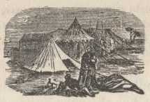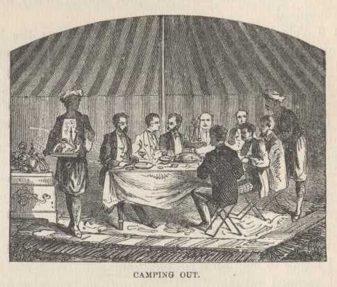 It grew dark, and they put candles on the tables—candles set in bright, new, brazen candlesticks. And soon the bell—a genuine, simon-pure bell—rang, and we were invited to “the saloon.” I had thought before that we had a tent or so too many, but now here was one, at least, provided for; it was to be used for nothing but an eating-saloon. Like the others, it was high enough for a family of giraffes to live in, and was very handsome and clean and bright-colored within. It was a gem of a place. A table for eight, and eight canvas chairs; a table-cloth and napkins whose whiteness and whose fineness laughed to scorn the things we were used to in the great excursion steamer; knives and forks, soup-plates, dinner-plates—every thing, in the handsomest kind of style. It was wonderful! And they call this camping out. Those stately fellows in baggy trowsers and turbaned fezzes brought in a dinner which consisted of roast mutton, roast chicken, roast goose, potatoes, bread, tea, pudding, apples, and delicious grapes; the viands were better cooked than any we had eaten for weeks, and the table made a finer appearance, with its large German silver candlesticks and other finery, than any table we had sat down to for a good while, and yet that polite dragoman, Abraham, came bowing in and apologizing for the whole affair, on account of the unavoidable confusion of getting under way for a very long trip, and promising to do a great deal better in future!