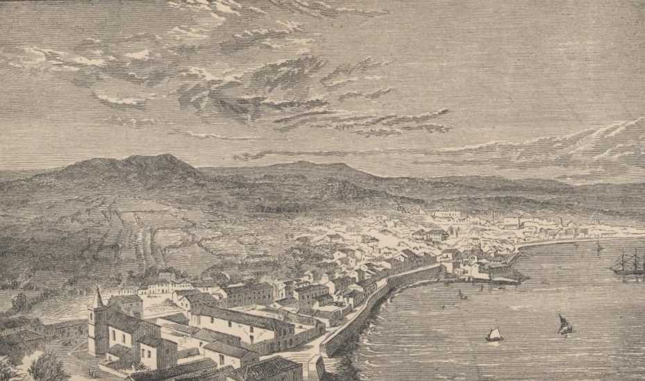 As we came down through the town we encountered a squad of little donkeys ready saddled for use. The saddles were peculiar, to say the least. They consisted of a sort of saw-buck with a small mattress on it, and this furniture covered about half the donkey. There were no stirrups, but really such supports were not needed—to use such a saddle was the next thing to riding a dinner table—there was ample support clear out to one’s knee joints. A pack of ragged Portuguese muleteers crowded around us, offering their beasts at half a dollar an hour—more rascality to the stranger, for the market price is sixteen cents. Half a dozen of us mounted the ungainly affairs and submitted to the indignity of making a ridiculous spectacle of ourselves through the principal streets of a town of 10,000 inhabitants.