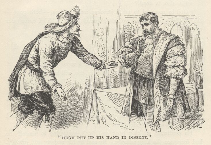 Hugh, red-faced, and almost suffocated, reeled to the nearest chair, and commanded the servants to seize and bind the murderous stranger.  They hesitated, and one of them said—