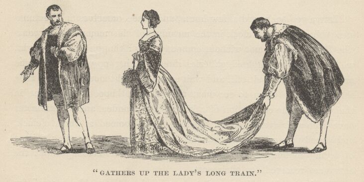 At seven o’clock the first break in the drowsy monotony occurs; for on the stroke of this hour the first peeress enters the transept, clothed like Solomon for splendour, and is conducted to her appointed place by an official clad in satins and velvets, whilst a duplicate of him gathers up the lady’s long train, follows after, and, when the lady is seated, arranges the train across her lap for her.  He then places her footstool according to her desire, after which he puts her coronet where it will be convenient to her hand when the time for the simultaneous coroneting of the nobles shall arrive.