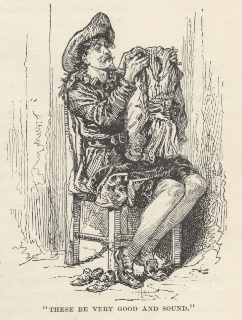 “These be noble large stitches!”—holding the garment up and viewing it admiringly—“they have a grandeur and a majesty that do cause these small stingy ones of the tailor-man to look mightily paltry and plebeian—