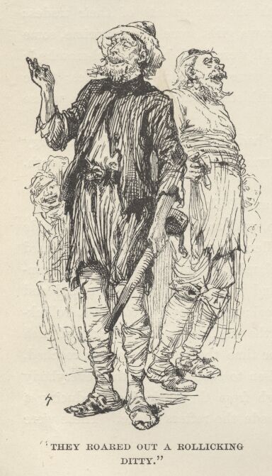 One of the blind men got up, and made ready by casting aside the patches that sheltered his excellent eyes, and the pathetic placard which recited the cause of his calamity.  Dot-and-go-One disencumbered himself of his timber leg and took his place, upon sound and healthy limbs, beside his fellow-rascal; then they roared out a rollicking ditty, and were reinforced by the whole crew, at the end of each stanza, in a rousing chorus.  By the time the last stanza was reached, the half-drunken enthusiasm had risen to such a pitch, that everybody joined in and sang it clear through from the beginning, producing a volume of villainous sound that made the rafters quake.  These were the inspiring words:—