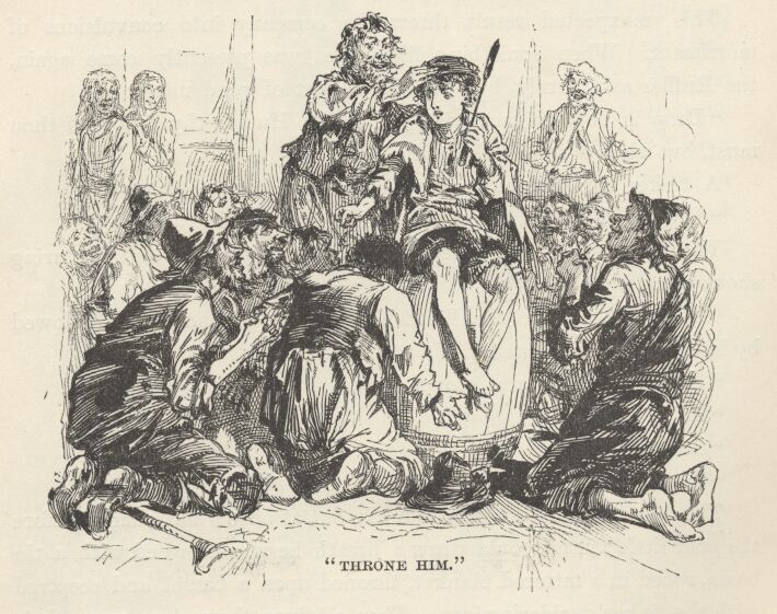 These and twenty other cries broke out at once! and almost before the poor little victim could draw a breath he was crowned with a tin basin, robed in a tattered blanket, throned upon a barrel, and sceptred with the tinker’s soldering-iron.  Then all flung themselves upon their knees about him and sent up a chorus of ironical wailings, and mocking supplications, whilst they swabbed their eyes with their soiled and ragged sleeves and aprons—