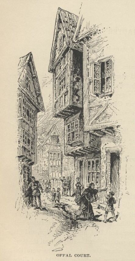 The house which Tom’s father lived in was up a foul little pocket called Offal Court, out of Pudding Lane.  It was small, decayed, and rickety, but it was packed full of wretchedly poor families. Canty’s tribe occupied a room on the third floor.  The mother and father had a sort of bedstead in the corner; but Tom, his grandmother, and his two sisters, Bet and Nan, were not restricted—they had all the floor to themselves, and might sleep where they chose.  There were the remains of a blanket or two, and some bundles of ancient and dirty straw, but these could not rightly be called beds, for they were not organised; they were kicked into a general pile, mornings, and selections made from the mass at night, for service.